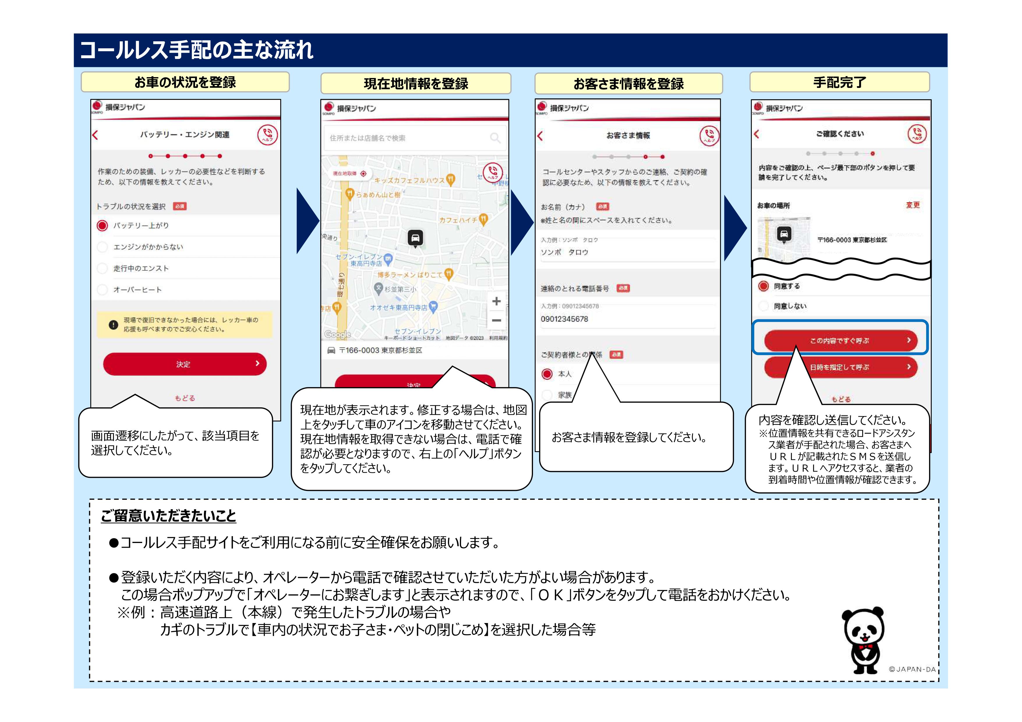 スマートフォン上でトラブル内容を入力し、GPS情報を送信いただくことで、迅速にロードアシスタンスをご利用いただけます。